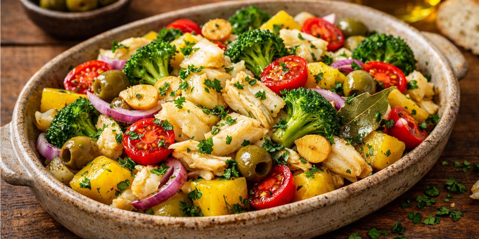 - Transfira esse azeite com a cebola para um refratário, adicionando as batatas, o bacalhau e os brócolis, deixando tudo esfriar.